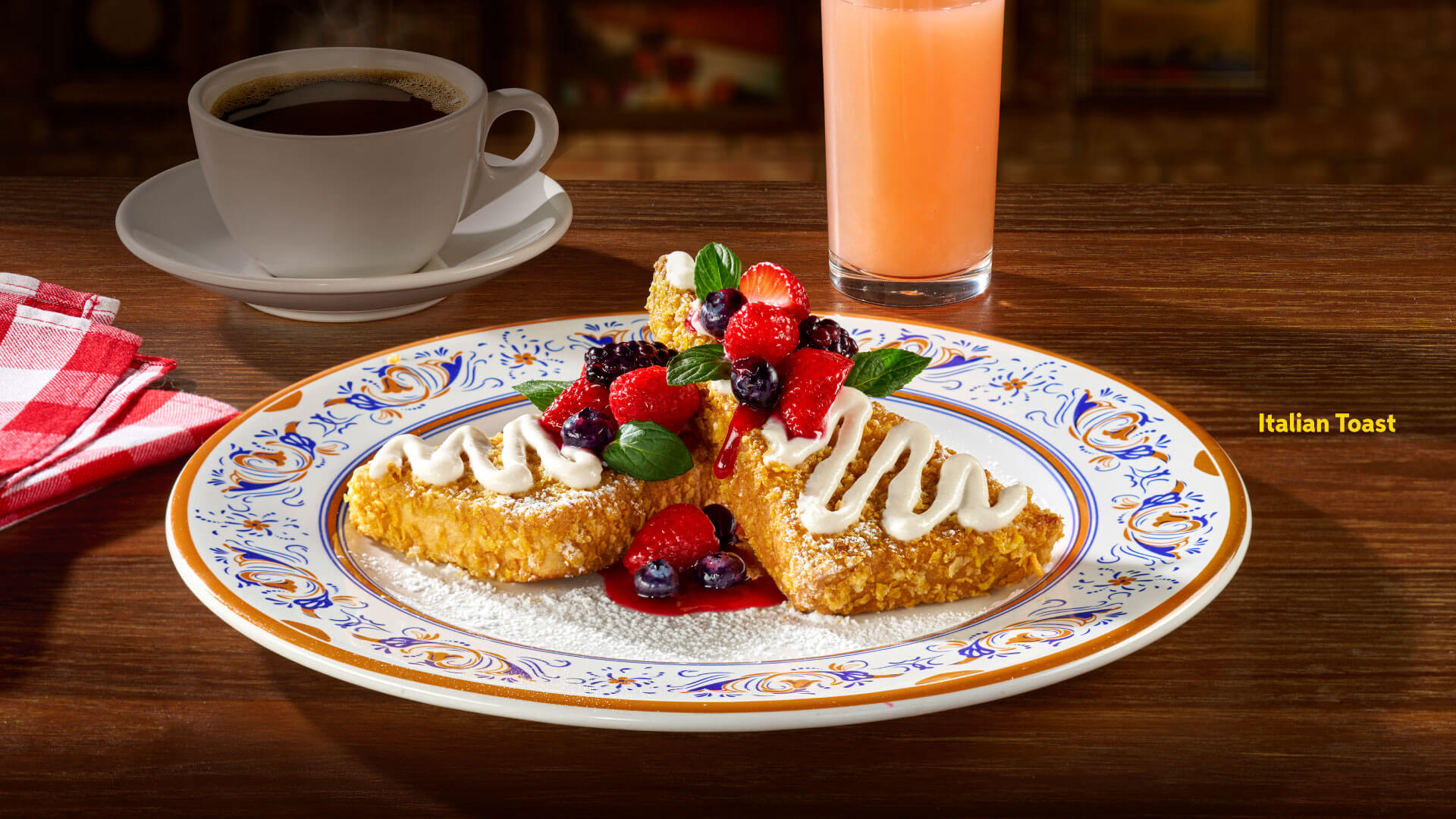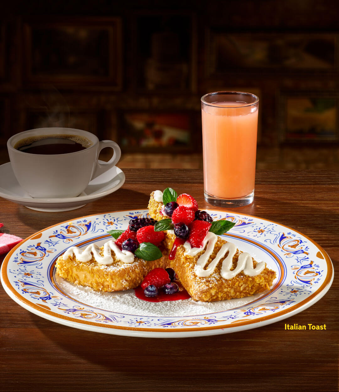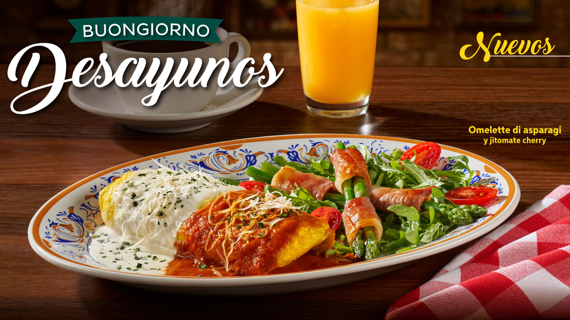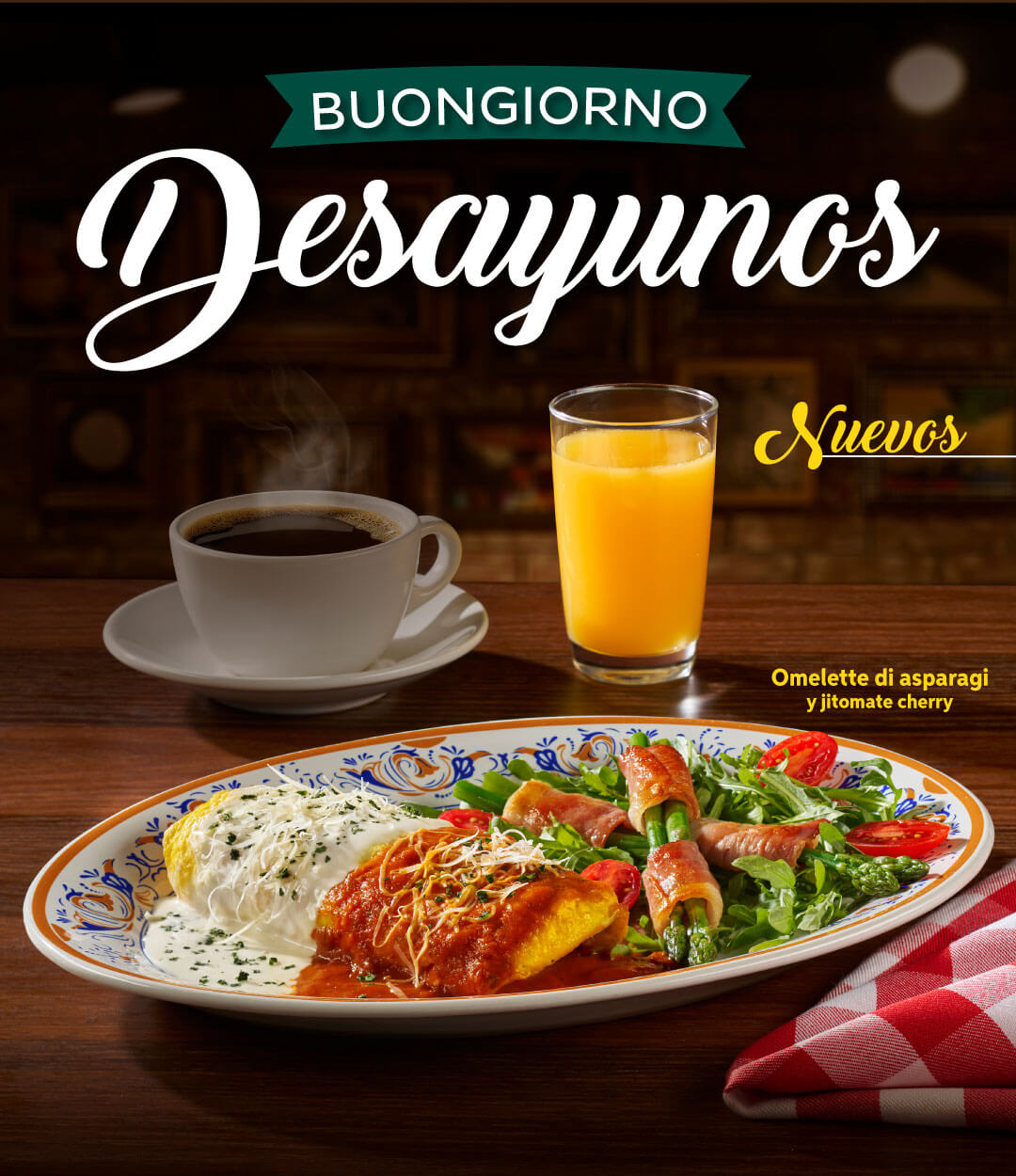 Italcafé, S.A. de C.V. en Av. Revolución 1267 piso 21, Col. Alpes, Álvaro Obregón, CDMX, C.P. 01040 y subfranquicias te ofrecen: “Desayunos Buon Giorno” (Buenos días): Omelette di Asparagi y Jitomate Cherry (389 g / 875 cal) por $179, Pane Tostado con Avocado (2 pizas / 258 g / 302 cal) por $185, Enfrijoladas con cecina (3 piezas / 549 g / 1071 cal) por $185, Italian Toast (2 piezas / 468 g / 1043 cal) por $179 o Smoothie por $109 c/u de Maracuyá (443 mL / 264 cal), Guayaba (443 mL / 258 cal) o Betabel (443 mL / 213 cal). Por $49 pesos más, agrega a tu desayuno: un vaso de jugo natural de temporada* (235 mL) o fruta chica de temporada* (113 g) y una taza de café americano rellenable (205 mL) o té de sobre (205 mL) Flor de la Paz: Verde, frutos rojos o manzanilla y por $19 pesos más, convierte tu vaso de jugo en garrafa (473 mL). *Consulta jugos y fruta de temporada en Restaurantes. Disponible de la apertura del restaurante a las 13:00 hrs. Vigencia del 05 de mayo del 2025 al 03 de mayo de 2026. Válido en consumo dentro de restaurante. Sujeto a disponibilidad de platillos en Restaurante. Válido en todos los restaurantes Italianni’s de la República Mexicana de lunes a domingo, excepto en sucursales Buenavista CDMX, Cd. del Carmen, Galerías Zacatecas y Xalapa. Viernes, sábados y domingos: Insurgentes. Sábados y domingos: Aguascalientes, Galerías Guadalajara, Galerías Querétaro, León Altacia, León Plaza Mayor, Querétaro Antea y Guadalajara Gran Plaza. No aplica con otras promociones, cupones, cortesías, certificados o descuentos. No aplica en servicio a domicilio ni para llevar. Consulta restaurantes y menú en www.italiannis.com.mx. Precios en MXN. Todos nuestros precios incluyen IVA. COME BIEN. Nuestros alimentos son procesados con equipo y en un ambiente en contacto con alérgenos como: huevo, pescado, nueces de árbol, cacahuates, mariscos, lácteos, soya y trigo. Los gramajes en todos nuestros alimentos son aproximados antes de su cocción y/o preparación.