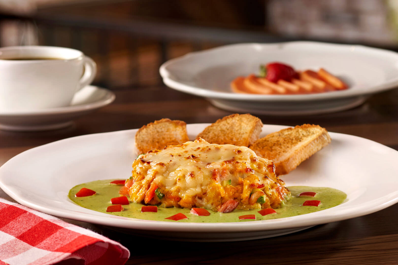 Huevos revueltos con calabazas y tocino (28 g) con un toque de chipotle, gratinados con queso Mozzarella y rebanadas de pan toscano, servidos sobre nuestra tradicional salsa Alfredo y Pesto.