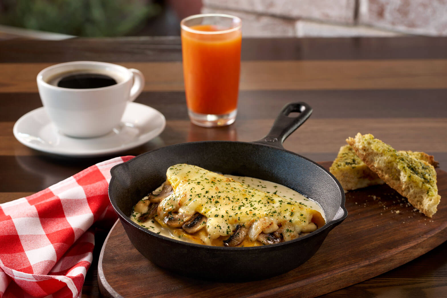 Omelette con espárragos, queso Cenizo de Cabra y nuestra cremosa salsa con un toque de chipotle. Acompañado de pan toscano con mantequilla al ajo.