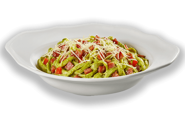 Pasta salteada en una combinación de salsa Alfredo y Pesto, acompañada de jitomate y Pancetta (tocino) horneada (28 g).